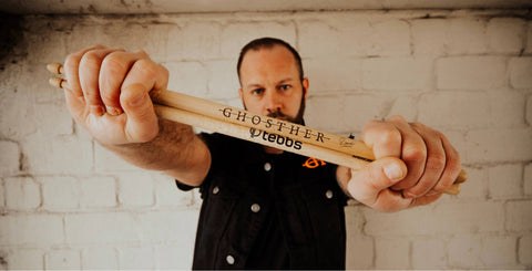 Since 2014, Ronnie has been driving the band Ghosther's sound forward with his powerful playing. Whether in the studio or on stage, his energetic style significantly influences the music. He swears by personalized sticks from tebbs not only for their outstanding craftsmanship and feel, but also for the individual design that perfectly suits him and his band. 🔥🥁